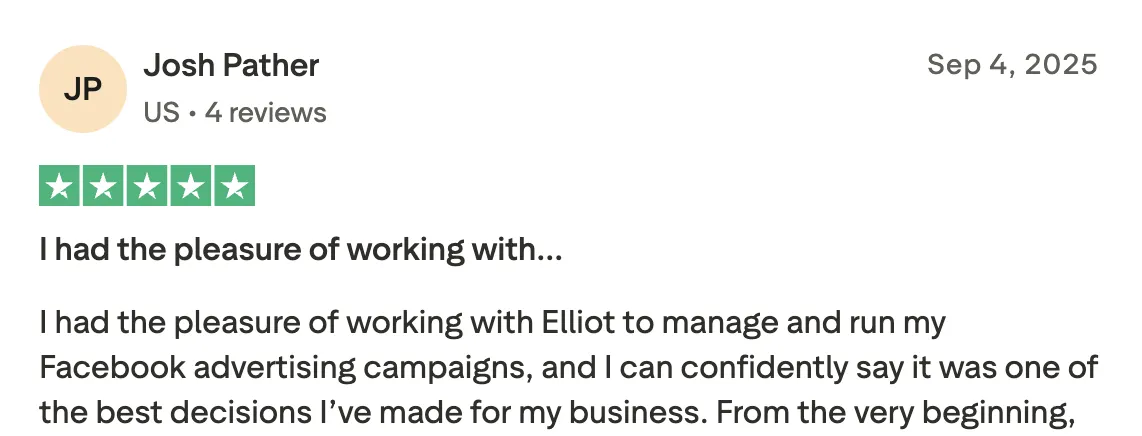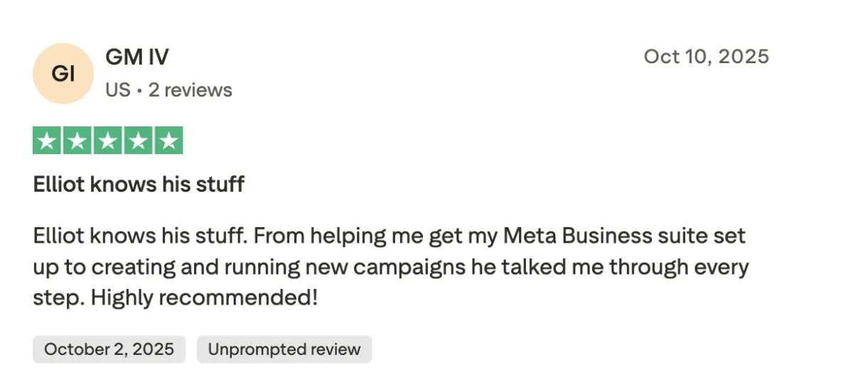 Over the past seven years, I’ve averaged a 4.3× ROAS across my own businesses and client accounts, including leading brands in financial education, online courses, Local service businesses, and SaaS companies. I’ve also coached 600+ agency owners on running ads profitably.